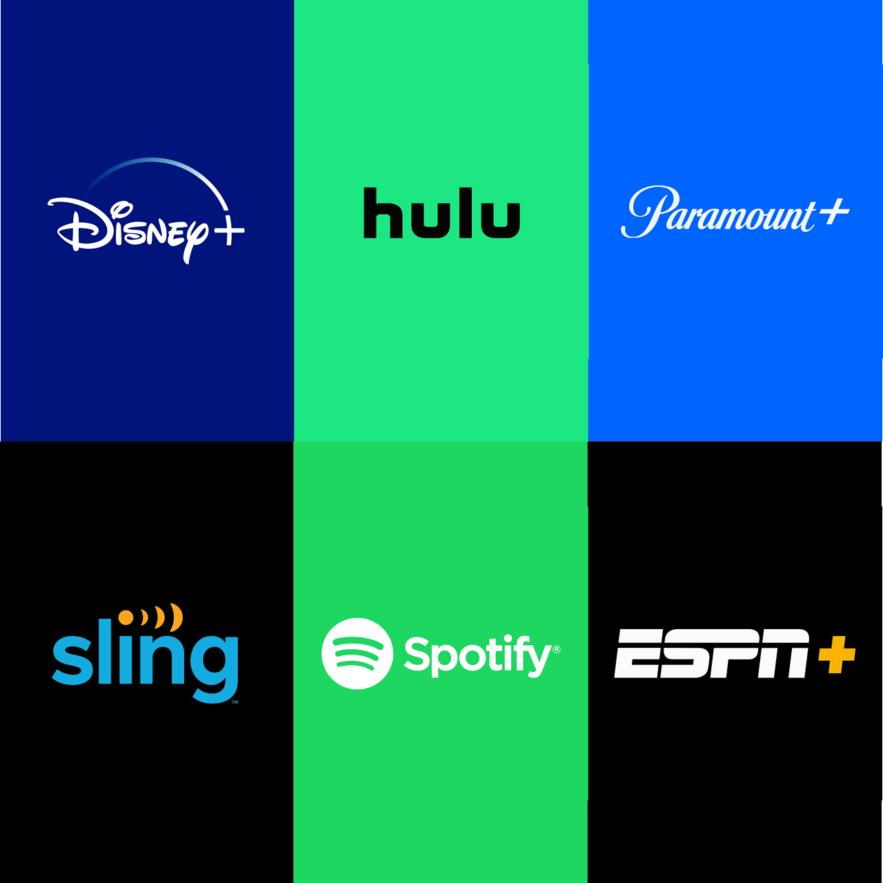 This bundle includes the following plans: Hulu (With Ads) + Live TV, Disney+ (With Ads) and ESPN+ (With Ads), Spotify Individual, Sling TV Orange, Paramount+ Premium. GET 1 month of premium streaming and entertainment. Enjoy a combined selection of movies, series, live TV, and music from the included plans at one bundled price.